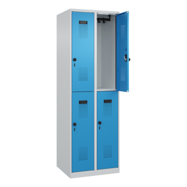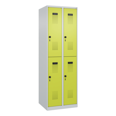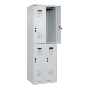 Doppelstöckiger Spind Evolo PLUS mit hochwertiger Einbrennbeschichtung für hohe UV- und Korrosionsbeständigkeit. Geschlossene und abgeschrägte Seitenprofile für leichte Innenreinigung und komfortable Entnahme von Kleidung und Taschen. Geeignet für verdeckte Kabelführung. Mit hinteren Belüftungsöffnungen oben und unten. Innen je Fach 1 stabile Garderobenstange aus Ovalprofil mit 3 verdrehsicheren Doppel-Schiebehaken inkl. Systemaufnahme. Türöffnungsbegrenzer als Schutz vor Überdehnen der Tür. Türen rechts angeschlagen, mit Soft-Anschlag und geschlossenen Seitenprofilen für höchste Stabilität. Aufhängung in stabilen Drehbolzen. Ergonomische Sicherheits-Drehriegel für Vorhangschlösser mit Bügelstärke 6 bis 8 mm. Inkl. Tür-Schutz. Kunststoff-Etikettenrahmen, schwarz, selbstklebend, inkl. Klarsichtkunststoff-Abdeckung und weißem Etikett zur individuellen Beschriftung. Achtung: Anlieferungsmöglichkeit durch Sattelschlepper muss gegeben sein.