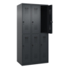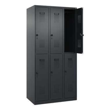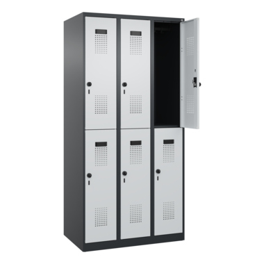 Doppelstöckiger Spind Evolo PLUS mit hochwertiger Einbrennbeschichtung für hohe UV- und Korrosionsbeständigkeit. Geschlossene und abgeschrägte Seitenprofile für leichte Innenreinigung und komfortable Entnahme von Kleidung und Taschen. Geeignet für verdeckte Kabelführung. Mit hinteren Belüftungsöffnungen oben und unten. Innen je Fach 1 stabile Garderobenstange aus Ovalprofil mit 3 verdrehsicheren Doppel-Schiebehaken inkl. Systemaufnahme. Türöffnungsbegrenzer als Schutz vor Überdehnen der Tür. Türen rechts angeschlagen, mit Soft-Anschlag und geschlossenen Seitenprofilen für höchste Stabilität. Aufhängung in stabilen Drehbolzen. Ergonomische Sicherheits-Drehriegel für Vorhangschlösser mit Bügelstärke 6 bis 8 mm. Inkl. Tür-Schutz. Kunststoff-Etikettenrahmen, schwarz, selbstklebend, inkl. Klarsichtkunststoff-Abdeckung und weißem Etikett zur individuellen Beschriftung. Achtung: Anlieferungsmöglichkeit durch Sattelschlepper muss gegeben sein.