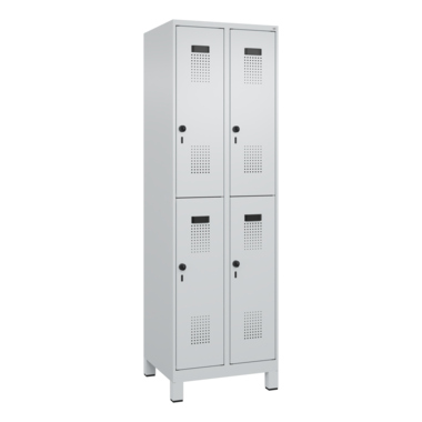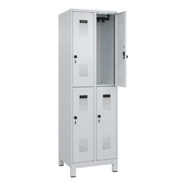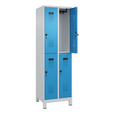 Doppelstöckiger Spind Evolo PLUS mit hochwertiger Einbrennbeschichtung für hohe UV- und Korrosionsbeständigkeit. Geschlossene und abgeschrägte Seitenprofile für leichte Innenreinigung und komfortable Entnahme von Kleidung und Taschen. Geeignet für verdeckte Kabelführung. Mit hinteren Belüftungsöffnungen oben und unten. Innen je Fach 1 stabile Garderobenstange aus Ovalprofil mit 3 verdrehsicheren Doppel-Schiebehaken inkl. Systemaufnahme. Türöffnungsbegrenzer als Schutz vor Überdehnen der Tür. Türen rechts angeschlagen, mit Soft-Anschlag und geschlossenen Seitenprofilen für höchste Stabilität. Aufhängung in stabilen Drehbolzen. Ergonomische Sicherheits-Drehriegel für Vorhangschlösser mit Bügelstärke 6 bis 8 mm. Inkl. Tür-Schutz. Kunststoff-Etikettenrahmen, schwarz, selbstklebend, inkl. Klarsichtkunststoff-Abdeckung und weißem Etikett zur individuellen Beschriftung. Achtung: Anlieferungsmöglichkeit durch Sattelschlepper muss gegeben sein.