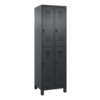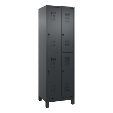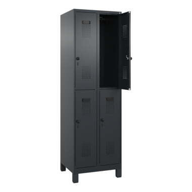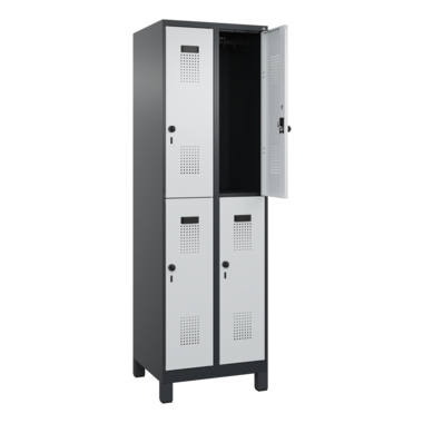 Doppelstöckiger Spind Evolo PLUS mit hochwertiger Einbrennbeschichtung für hohe UV- und Korrosionsbeständigkeit. Geschlossene und abgeschrägte Seitenprofile für leichte Innenreinigung und komfortable Entnahme von Kleidung und Taschen. Geeignet für verdeckte Kabelführung. Mit hinteren Belüftungsöffnungen oben und unten. Innen je Fach 1 stabile Garderobenstange aus Ovalprofil mit 3 verdrehsicheren Doppel-Schiebehaken inkl. Systemaufnahme. Türöffnungsbegrenzer als Schutz vor Überdehnen der Tür. Türen rechts angeschlagen, mit Soft-Anschlag und geschlossenen Seitenprofilen für höchste Stabilität. Aufhängung in stabilen Drehbolzen. Ergonomische Sicherheits-Drehriegel für Vorhangschlösser mit Bügelstärke 6 bis 8 mm. Inkl. Tür-Schutz. Kunststoff-Etikettenrahmen, schwarz, selbstklebend, inkl. Klarsichtkunststoff-Abdeckung und weißem Etikett zur individuellen Beschriftung. Achtung: Anlieferungsmöglichkeit durch Sattelschlepper muss gegeben sein.