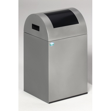 Wertstoffsammelgerät zum Sammeln und Trennen von ungefährlichen Wertstoffen, Papier und Restmüll, mit Selbstlöschfunktion im Brandfall. Kopfteil mit selbstschließender Einwurfklappe, abnehmbar. Ausgerüstet mit Klemmring zur Befestigung des Abfallsackes. Bodenschonender Kantenschutz in silber-grau. Die Wertstoffsammelgeräte sind nicht zum Sammeln und Entsorgen von gefährlichen und hochentzündlichen Stoffen vorgesehen und geeignet.