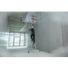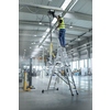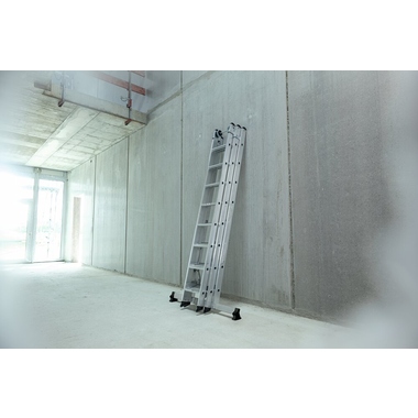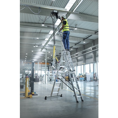 Stufen-Mehrzweckleiter, einsetzbar als Steh-, Anlege- und Schiebeleiter. Stabile Rechteckrohr-Holme. 80 mm tiefe, geriffelte Stufen. 4-fach gebördelte Stufen-/Holmverbindung. Nivello® Leiterschuhe und nivello® Traverse. Einfache Höhenverstellung und sichere Arretierung dank Steckhaken mit automatisch einrastender Abhebesicherung. Oberleiter mit Wandlaufrollen. Spreizsicherung mit zwei hochfesten Polyestergurten und lösbarer Metallstrebe.
