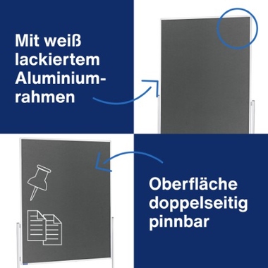 Moderationstafel für alle Büro- und Schulungsräume. Für stationären Einsatz und hohen Komfort: Sicherer Stand durch abgewinkelte Stellfüße. Erlauben die Anordnung mehrerer Wände im Moderationskreis.