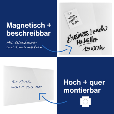 Glasboards sind die moderne, elegante Alternative zu herkömmlichen Whiteboards. Sie überzeugen durch das elegante + luxuriöse Erscheinungsbild mit purer Ästhetik. Die Boards lassen sich in jeder gewünschten Kombination montieren: Nebeneinander, untereinander oder im rechten Winkel zueinander. Durch ihre Farbe, Form und das ansprechende Erscheinungsbild fügen sich die Glasboards perfekt in jede Inneneinrichtung ein. Es haften nur Neodym-Magnete.